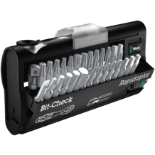 Bits and sockets. Bits can be connected directly. However, a holder can be connected first and then the bit can be attached to this. This then serves as an extension with a free-turning sleeve. An adaptor e.g. Wera 870/1 is needed for sockets – ¼" hexagonal on a square drive (included in the Bit-Check and with the individual Zyklop Mini 1 in the set).