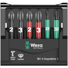 6 Wera Impaktor bits tidily arranged in a minimum of space in a practical Bit-Check. The Impaktor technology offers an above-average service life even under extreme circumstances thanks to the best possible utilisation of the material properties and the optimised geometry. The bit tip is coated with tiny diamond particles; this reduces the risk of any slipping out of the screw head thanks to the enhanced frictional resistance.