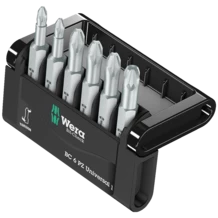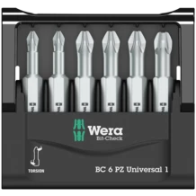 6 50 mm-long Wera Pozidriv* bits tidily arranged in a minimum of space in a practical Bit-Check. The tough viscous bits are suitable for universal use. Torsion design to combat premature wear. * Pozidriv = registered trademark of European Industrial Service Ltd.
