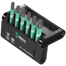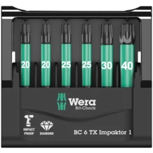 6 Wera Impaktor bits tidily arranged in a minimum of space in a practical Bit-Check. The Impaktor technology offers an above-average service life even under extreme circumstances thanks to the best possible utilisation of the material properties and the optimised geometry. The bit tip is coated with tiny diamond particles; this reduces the risk of any slipping out of the screw head thanks to the enhanced frictional resistance.
