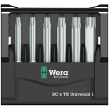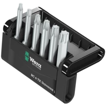 6 50 mm-long Wera TORX® bits tidily arranged in a minimum of space in a practical Bit-Check. The tough viscous bits are suitable for universal use.