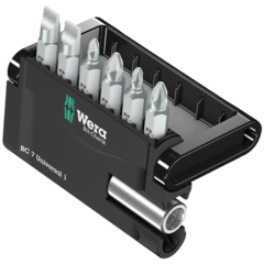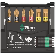 Bits with tiny diamond particles on the bit tip. This ensures a secure fit in the screw head, reduces the contact pressure required and lowers the risk of slipping. BiTorsion bits with a torsion zone - where kinetic energy is diverted from peak loads. This greatly extends the product service life. Comes with Rapidaptor technology, which allows bits to be attached without any need to actuate the sleeve. The removal of the bit is simple, just by pushing the sleeve forward - for rapid bit change with just one hand. For insertion in the power screwdriver or into the chuck of the power drill. The multi-component Bit-Check is convincing on account of its low weight and the maximum possible degree of compactness. In this respect, the soft material in the lower section of the Bit-Check ensures that the bits are securely held whilst being simple to remove at the same time. The profile and size of the bits are easy to recognise thanks to the Wera Take it easy Tool Finder with its colour coding and clearly visible imprint.