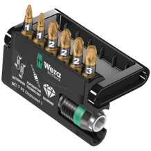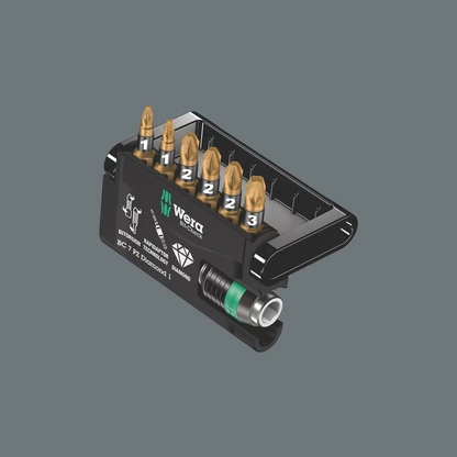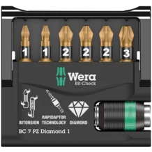 Bits with tiny diamond particles on the bit tip. This ensures a secure fit in the screw head, reduces the contact pressure required and lowers the risk of slipping. BiTorsion bits with a torsion zone - where kinetic energy is diverted from peak loads. This greatly extends the product service life. Comes with Rapidaptor technology, which allows bits to be attached without any need to actuate the sleeve. The removal of the bit is simple, just by pushing the sleeve forward - for rapid bit change with just one hand. For insertion in the power screwdriver or into the chuck of the power drill. The multi-component Bit-Check is convincing on account of its low weight and the maximum possible degree of compactness. In this respect, the soft material in the lower section of the Bit-Check ensures that the bits are securely held whilst being simple to remove at the same time. The profile and size of the bits are easy to recognise thanks to the Wera Take it easy Tool Finder with its colour coding and clearly visible imprint.