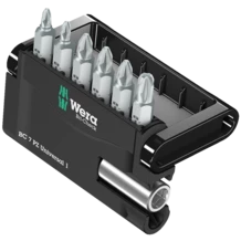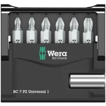 6 Wera Pozidriv bits tidily arranged in a minimum of space in a practical Bit-Check. Tough viscous Wera bits for hexagon head screws and universal use. 1 universal holder 893/4/1 K for insertion in the power screwdriver or for use in the chuck of the electric drill.