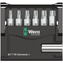 6 Wera TORX® bits tidily arranged in a minimum of space in a practical Bit-Check. Tough viscous Wera bits for universal use. 1 universal holder 893/4/1 K for insertion in the power screwdriver or for use in the chuck of the electric drill.