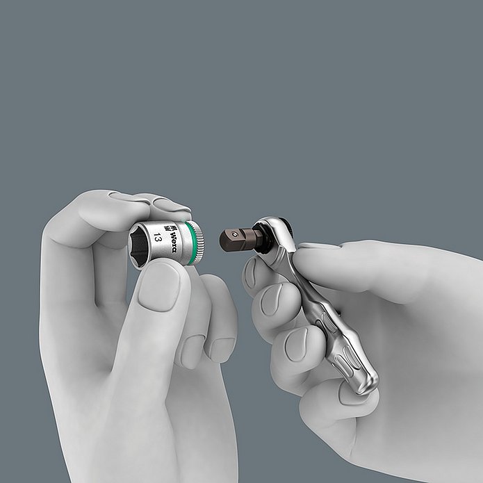 The Zyklop Mini 1 mini ratchet allows particularly quick screwdriving, even in narrow work situations. With direct bit mounting. With the Wera 870/1 adapter (1/4"-hexagon to 1/4"-square head), ¼" sockets can also be operated.