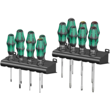 Comprehensive screwdriver set with all the screwdrivers the professional needs. Kraftform Plus handle for pleasant, ergonomic working that prevents blisters and calluses. Hard gripping zones for high working speeds whereas soft zones ensure high torque transfer. Lasertip - for slotted, Phillips and Pozidriv - literally bites into the head of the screw and thereby prevents any slipping out of the screw head. Take it easy Tool Finder: colour coding according to profile and size. The anti-roll feature prevents any bothersome rolling away at the workplace.