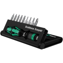 9 Wera bits. 1 holder 813 R Kraftform with Rapidaptor quick-release chuck, multi-component for high working speeds and particularly ergonomic screwdriving.