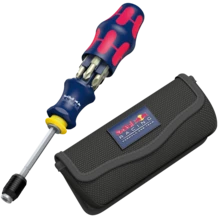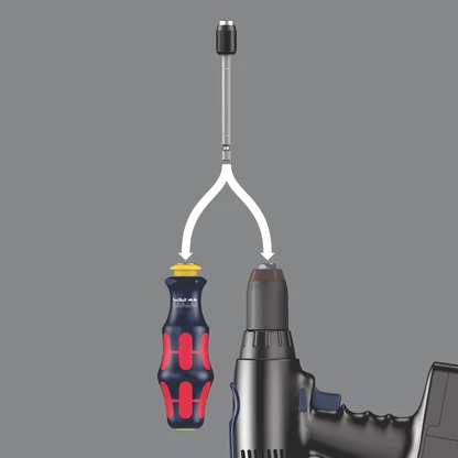 The sets in the series Kraftform Kompakt 20 are really something. A 2 position telescopic blade can be retracted into the handle for confined space operation or extended for more reach. It can also be removed and used as a 100 mm bit holder in the power tool. Six bits are conveniently integrated into a push-button opening bit magazine. The Rapidaptor technology ensures rapid one hand bit changes, press-in auto bit lock and a secure positioning when used in power tools thanks to the free-turning sleeve.