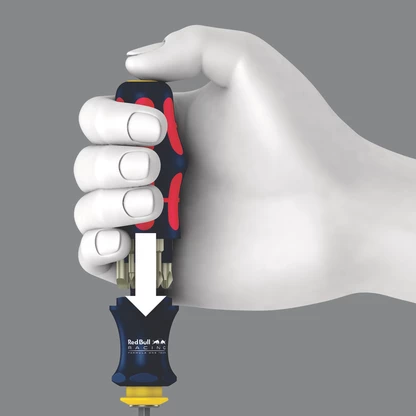 Indispensable for all motor sport fans with demands on high quality tools: The Red Bull Racing Compact Tool with 6 stainless steel screwdriving bits in the handle - made by Wera.The set allows both manual screwdriving operations as well as power tool applications. The bayonet blade that can be lowered into the handle with quick-release chuck enables screwdriving even in very confined working environments. Additionally, the blade can be removed and inserted in a cordless driver. Kraftform screwdriver handle: hard gripping zones for high working speeds, softer zones for high torque transfer.In a practical belt pouch in the Red Bull Racing design.The reverse of the box has a nonwoven surface and it also comes with a Velcro strip to affix the box to any surface.