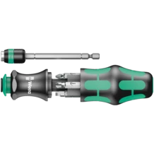 Wera compact tools enable both manual as well as power tool operations at the same time. The handle/interchangeable blade system in a compact design with various blade tips in the smallest of spaces makes the user more mobile and flexible. Suitable for bits with ¼" hexagon head drive as per DIN ISO 1173-C 6.3 and E 6.3 (ISO 1173) and Wera connecting series 1 and 4. Comes with an adaptor, bayonet and Rapidaptor technology. Kraftform handle with anti-roll feature, multi-component for particularly ergonomic screwdriving. Integrated magazine for bit storage. The telescopic bayonet blade - which can be lowered into the handle - together with the quick-release chuck allows fast manual work even in confined installation situations when the blade is retracted. The blade can be extended by simply actuating the locking sleeve. The bayonet holder can then be used as a fully-fledged screwdriver. The bayonet blade can be removed and used as a power tool adaptor, but can also be retracted once again to its original position. Includes practical belt pouch.