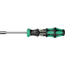 Kraftform bitholding screwdriver for 1/4" hex drive bits. The ratchet with fine toothing integrated in the handle allows fast working. Switching the screwdriving direction is intuitive: Turn the ring switch clockwise for clockwise screwdriving, turn it counterclockwise for counterclockwise screwdriving. Use position 0 to deactivate the ratchet mechanism for precise working. Includes 6 tough bits for universal use; stored in the bit magazine integrated in the handle. The strong permanent magnet in the 1/4" bit mounting ensures secure holding of the bit. The 2-component Kraftform handle with the combination of hard and soft zones allows for a firm grip and precise working.