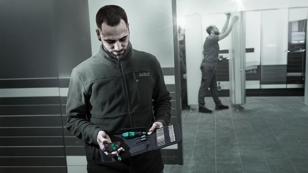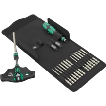 18-piece set in a robust textile box. One 416 RA T-handle bitholding screwdriver with ratchet functionality and Rapidaptor quick-release chuck for ¼" bits. The integrated ratchet with fine toothing (80 teeth/return angle 4,5°) eases and accelerates screwdriving without having to reposition the tool. The ratchet mechanism completely embedded in the handle ensures very handy and comfortable work. With reversing lever for comfortable clockwise/counterclockwise direction change in one-hand operation. The ergonomic shape of the handle fills the ball of the hand well, the fingers lie securely in the softly rounded recessed grips. The whole hand comes into contact with the handle, friction loss between hand and handle is avoided. Bitholding screwdriver for bits with 1/4" external hexagon drive as per DIN ISO 1173-C 6.3 and E 6.3. With Rapidaptor technology for lightning-fast bit changes. 14 tough bits, ¼", 89 mm length, for universal use. 2 nutsetters, magnetic, for easier application of the screw.