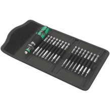 Pouch with 89-mm long ballpoint bits, which enable a swivelling or pivoting of the tool axis. Includes 816 R Kraftform holder with Rapidaptor quick-release chuck and multi-component Kraftform handle for low-fatigue working. Hard gripping zones for high working speeds whereas soft zones ensure high torque transfer. Suitable for manual and power tool operations; 17-piece.