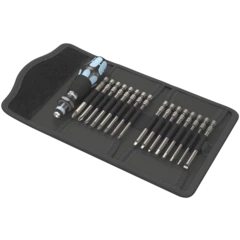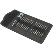 Pouch with bits in a length of 89 mm. Includes Kraftform holder 3816 R with Rapidaptor quick-release chuck and multi-component Kraftform handle for low-fatigue working. Stainless design to prevent the formation of extraneous rust.