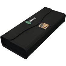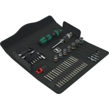 Compact tool set with the 41 most important screwdriving tools for applications involving wood. Includes the bit ratchet Zyklop Mini with extension and socket adaptor; 8 manual and power tool sockets, sizes 5.5-13, 1 ratchet holder 816 RA with ratcheting function, fine-pitched teeth for small return angle, switchover ring (right, fixed, left), maximum torque 50 Nm and bit take-up with the Rapidaptor technology; 1 universal bit holder; 6 bits in a length of 25 mm; 16 bits of a length of 89 mm; 5 wood twist drill bits with a diameter of 3-8 mm; 1 screw gripper for firmly holding screws; 1 single-pole phase tester 247; textile box, very robust and durable; can be positioned upright in the workshop shelf for convenient storage; additional surface protection thanks to the textile outer material; low weight and volume for simplified mobility.