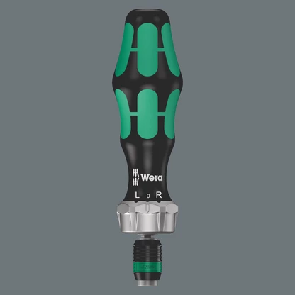 Ratchet screwdriver, fine-tooth design for minimal return angle, switchover ring (right, locked, left), maximum torque of up to 50 Newton metres, 1/4" hexagon chuck with Rapidaptor technology i.e. rapid-in, rapid-out, rapid-spin, chuck-all and single-hand function for rapid bit change, magnetic, suitable for hexagon socket insert bits as per DIN ISO 1173-C 6.3 and E 6.3 and Wera series 1 and 4