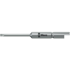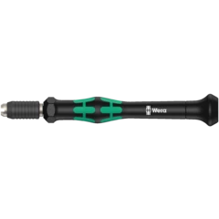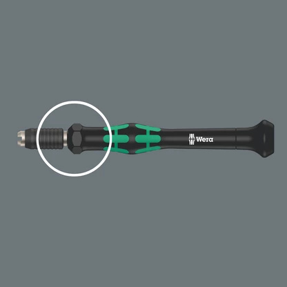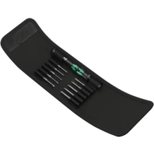 Kraftform Kompakt Micro Set for precision mechanical applications; suitable for the take-up of bits with 4 mm halfmoon drive (Wera series 9) and bits with 4 mm HIOS drive (Wera series 21); handle/interchangeable blade system for rapid blade change; Kaftform Micro handle with twist cap and free-turning zone for rapid twisting, making any time-consuming repositioning of the fingers unnecessary; power zone with integrated soft zones for the transfer of higher tightening and loosening torque; precision zone directly above the blade for the right angle for adjustment work; comes with 10 bits for manual as well as power tool operations; rapid fixing of the bit: just push the bit into the insert for automatic locking and a secure fit. To change the bit, simply push the sleeve forward and remove; free-turning sleeve for simple guidance of the tool during the screwdriving process.