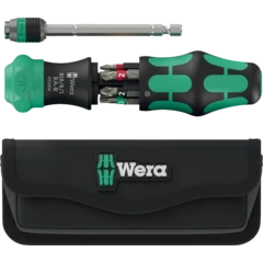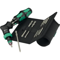 Kraftform pistol handle for 1/4" hex drive bits. The ratchet with fine toothing integrated in the handle allows fast working. Switching the screwdriving direction is intuitive: Turn the ring switch clockwise for clockwise screwdriving, turn it counterclockwise for counterclockwise screwdriving. Use position 0 to deactivate the ratchet mechanism for precise working. The Rapidaptor technology of the bitholding screwdriver makes for a quick bit change. Includes 6 BiTorsion bits for a long product life, tough, for universal use; stored in the bit magazine integrated in the handle. The strong permanent magnet in the 1/4" bit mounting ensures secure holding of the bit. The 2-component Kraftform pistol handle allows for high leverage. The robust holster can be attached to the belt.