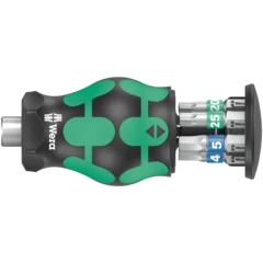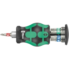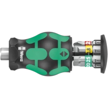 Particularly small bitholding screwdriver with short bit mounting for hard to reach areas. Includes 6 bits, which are located in a magazine in the handle. With only 65mm total length, the Kraftform Kompakt Stubby is a real mini screwdriving workshop. The strong permanent magnet in the bit mounting ensures secure holding of the bit. The 2-component handle with the practical combination of hard and soft zones allows for a firm grip and precise working. Take it easy tool finder: With size stamping and colour coding by output to find the required bit easily.