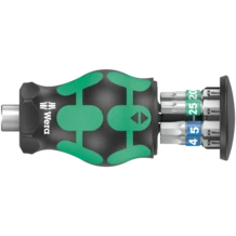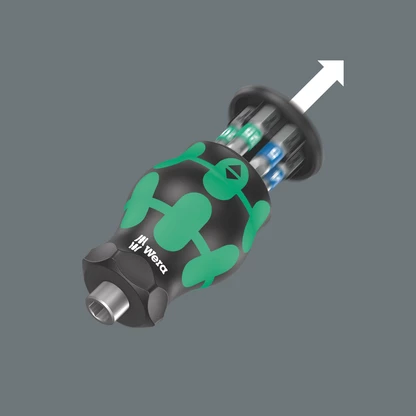 Particularly small bitholding screwdriver with short bit mounting for hard to reach areas. Includes 6 bits, which are located in a magazine in the handle. With only 65mm total length, the Kraftform Kompakt Stubby is a real mini screwdriving workshop. The strong permanent magnet in the bit mounting ensures secure holding of the bit. The 2-component handle with the practical combination of hard and soft zones allows for a firm grip and precise working. Take it easy tool finder: With size stamping and colour coding by output to find the required bit easily.