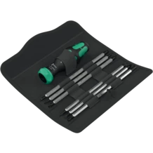 7-piece blade set. One Kraftform bitholding screwdriver with 6 mm hexagonal blade mounting for combination blades (double blades) from the Wera Vario range. The ratchet with fine toothing integrated in the handle allows fast working. Switching the screwdriving direction is intuitive: Turn the ring switch clockwise for clockwise screwdriving, turn it counterclockwise for counterclockwise screwdriving. Use position 0 to deactivate the ratchet mechanism for precise working. The 2-component Kraftform handle with the combination of hard and soft zones allows for a firm grip and precise working. 6 Wera Vario double blades (= 12 different profiles), 175 mm long, 6 mm hexagonal. In a robust folding pouch.