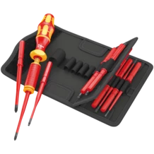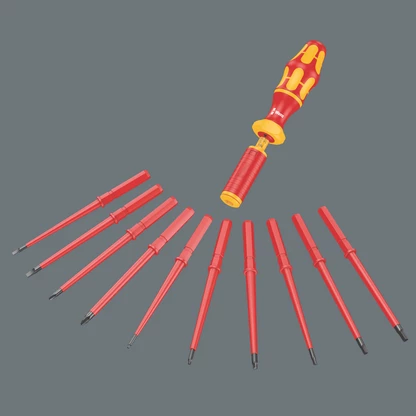 15-piece torque VDE interchangeable blade set. Includes 14 blades (12 of which with a reduced diameter) with integrated insulation protection. Torque VDE holder with adjustable torque from 1.2-3.0 Nm. Kraftform Plus handle: hard gripping zones for high working speeds whereas soft zones ensure high torque transfer.