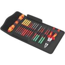 2x 817 VDE bladeholding screwdrivers for Wera VDE blades; 14 VDE blades (each 157 mm length) with reduced blade diameter (items Kraftform Kompakt 60 i Take it easy 0.4x2.5 and Kraftform Kompakt 67 i Take it easy TX 10 standard blade diameter), so that even low-lying screw and spring elements can be easily reached and operated. With Take it easy Tool finder: Colour coding by profile and laser-engraved size indication - for quick and easy identification of the required tool. Individually tested tools as per IEC 60900 at 10,000 V for safe working at the approved voltage of 1,000 V. 1x Knipex VDE 13 96 200 pliers for electrical installation; these pliers replace up to 6 individual tools for electrical installation: cutting, stripping, gripping, bending, deburring and crimping - all in one tool. With safety pawl for gentle gripping. Chrome-plated for better rust protection, with insulated multi-component handle sleeves. In a robust belt pouch. The textile box features a fleece zone at the back. Using the provided self-adhesive hook and loop fastener strips, the textile box can be attached to the Wera 2go components. Or to the wall, shelf or workshop trolley.