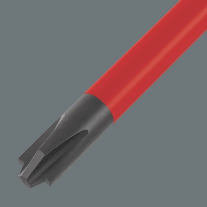 VDE blade for the Kraftform Kompakt handle/interchangeable blade system. Combination profile slotted and Phillips, especially for use with clips, fuse boxes, switches, relays. Lightning-fast blade changes without special tools. Individually tested at 10,000 V for safe working at the approved voltage of 1,000 V. Reduced blade diameter with integrated protective insulation, low-lying screw and spring elements can be easily reached and operated. The Wera Black Point tip offers fitting accuracy and optimised corrosion protection. With Take it easy tool finder: colour coding by profile and laser-engraved size indication. The hexagon anti-roll protection avoids blades from rolling away unintentionally.