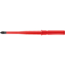 Interchangeable blade with reduced shaft diameter and integrated insulation protection; this means that low-lying screws and spring elements can be accessed and actuated. Individually tested tools as per IEC 60900. Individual testing at 10,000 volts so as to ensure safe working at the permitted voltage of 1,000 volts. The Wera Black Point tip offers a perfect fit and optimised corrosion protection.