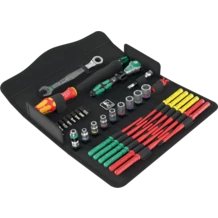 Compact tool set with the most important screwdriving tools for maintenance jobs both indoors as well as outdoors. One Kraftform 817 VDE bladeholding screwdriver solely for Wera VDE blades; 12 VDE blades (each 157 mm length) with Take it easy tool finder with colour coding by profile and laser-engraved size indication; 1 Kraftform series 300 screwdriver for slotted screws; 1 Joker ratcheting combination wrench with holding function, limit stop, small return angle and extremely high-grip toothing; incl. the incredibly fast 1/4" Zyklop Speed ratchet with accessories; 8 Zyklop manual and power tool sockets, 1 universal bit holder; 7 25mm bits; 1 screw gripper to firmly hold screws; textile box that is very robust and durable; can be positioned upright in the workshop shelf for tidy storage; additional surface protection thanks to the textile outer material; low weight and volume for simplified mobility.