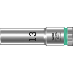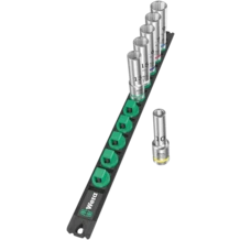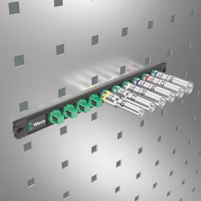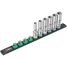 Socket rail with 6 long manual and machine sockets (non-impact), 1/2". A smooth rotary mechanism allows a secure hold and easy access of the sockets. Long 1/2" manual and machine sockets (ISO 2725 part 3) by Wera for manual and (non-impact) machine use even at low lying couplings and protruding thread rods. With Take it easy tool finder with colour coding by size - to help you find the required tool quickly and easily. Slip-proof for easy grip even with oily hands. With hexagon profile and ball stop groove. The hexagon profile enables the transmission of high forces and loads the edges of the bolt or the screw head less than a double hexagon profile. Fine-teethed ratchets also make use of a double hexagon profile superfluous, even in confined spaces, thanks to their small return angle. For external hexagon bolts and screws. The rail allows temporary attachment to metallic surfaces and, with its twist-to-unlock function, ensures secure locking and unlocking of the sockets.