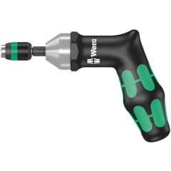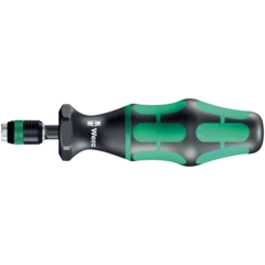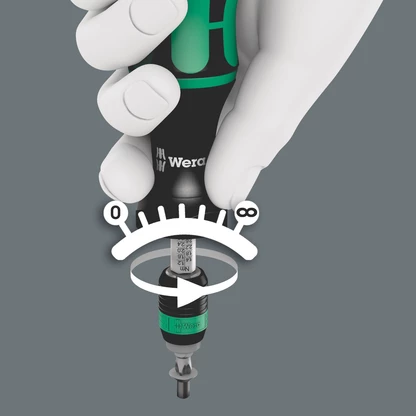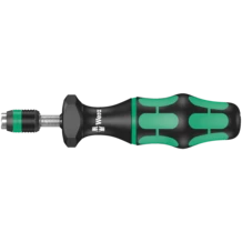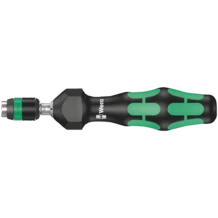 Wera torque screwdriver. Variable torque setting option with highest precision. Simple adjustment of the required torque value without any special tools. Easy-to-read scale value; audible click signal. Rapidaptor quick-release technology for rapid bit change. Unlimited torque to loosen seized screws. Multi-component Kraftform handle with hard and soft zones for high working speeds, whilst being easy on the hand. Suitable for bits with ¼" hexagon head drive as per DIN ISO 1173-C 6.3 and E 6.3 (ISO 1173).