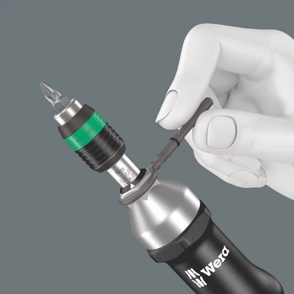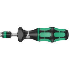 Wera torque screwdriver. Kraftform pistol handle for particularly high torque transfer, multi-component for high working speeds and particularly ergonomic screwdriving. Variable torque setting option with highest precision. Simple adjustment of the required torque value without any special tools. Easy-to-read scale value. Rapidaptor quick-release technology for rapid bit change. Unlimited torque to loosen seized screws. Multi-component Kraftform handle with hard and soft zones for high working speeds, whilst being easy on the hand. Suitable for bits with ¼" hexagon head drive as per DIN ISO 1173-C 6.3 and E 6.3 (ISO 1173).