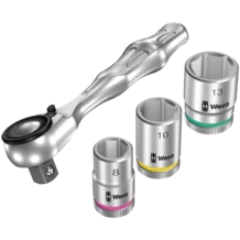 Zyklop Mini ratchet for easiest operation in cramped screwdriving applications, even with just one hand. Drop-forged solid steel design. Fine toothing mechanism with 60 teeth allows for a low return angle of 6° for precise working. The knurl allows fast screwdriving in cramped situations when there is no space for the ratchet. Easy clockwise/counterclockwise switching. Ergonomically shaped ratchet head and lever. Suitable for 1/4" sockets. 3 Zyklop sockets with ¼" drive. Take it easy tool finder: with colour coding by size - for quick and easy identification of the required tool.